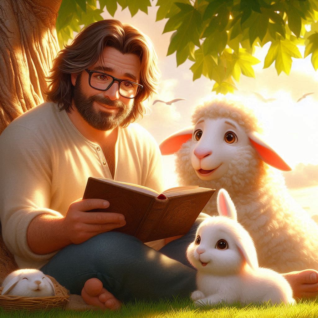 When he’s not helping Sheepy and Bunny go on their next big adventure, you’ll likely find him reading Jesus novels, or spiraling down a YouTube rabbit hole (with a glass of tea or soda and a few plush sidekicks close by), and tending to two demanding kitties.