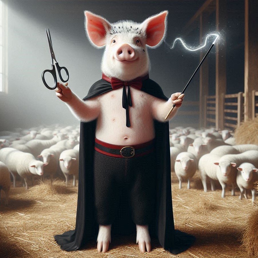Porcasso the pig is a hairdresser and magician extraordinaire. He makes a grand performance at the surprise party that Bunny threw for Sheepy. During the evening, Porcasso dresses Sheepy’s head wool, pulls Bunny out of a magic hat, and performs a personal and moving séance that leaves all the animals of the farm in awe.