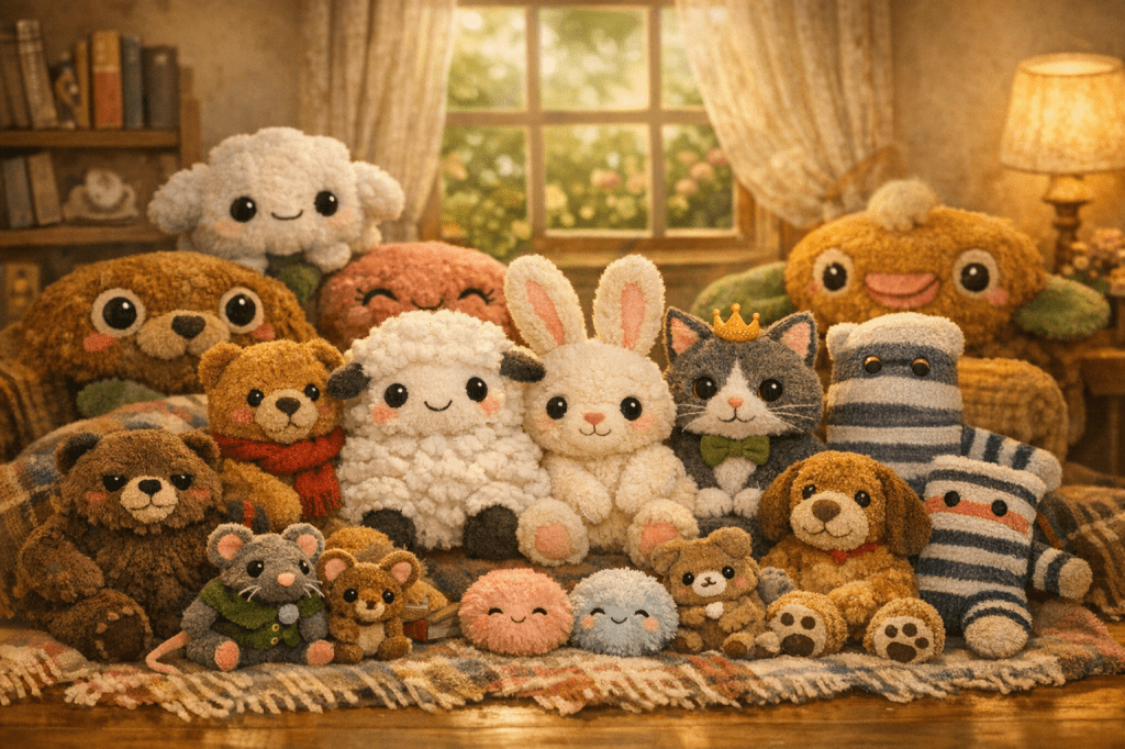 A cluster of blanket soft companions who wrap children (and startled adults) in comfort.