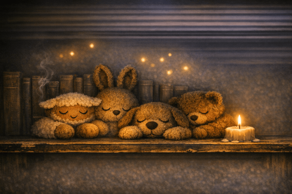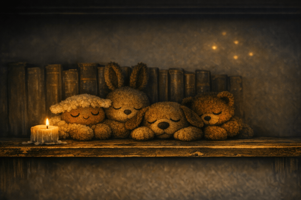 Journeys fade into hush and glow. The Meadow keeps its fifth shelf, and plush voices rest in shadowed memory. One candle flickers, steady and low, and hush gathers belonging in glow.