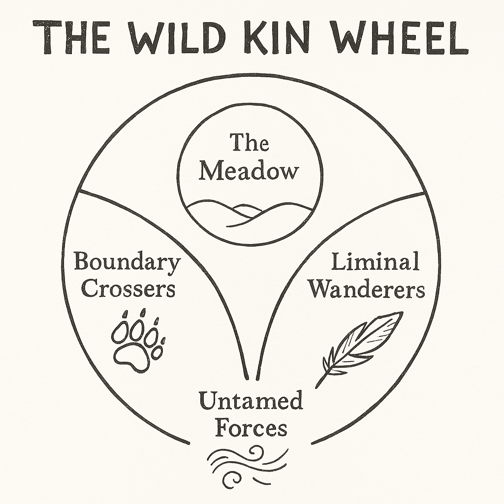 The Wild Kin Wheel shows how wild, untamed presence moves through the Meadow. The Wild Kin Wheel is not fixed—it turns with wind and paw, feather, and seam. It is not a cage but a turning: